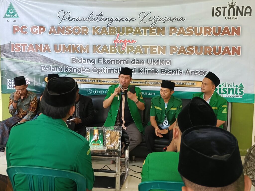 Pasuruan, 21 Agustus 2025 – Pimpinan Cabang Gerakan Pemuda (PC GP) Ansor Kabupaten Pasuruan terus memperkuat langkah nyata dalam bidang kemandirian ekonomi. Hal ini diwujudkan melalui penandatanganan kerjasama dengan ISTANA UMKM terkait pengembangan sektor ekonomi dan Usaha Mikro, Kecil, dan Menengah (UMKM), yang digelar pada Kamis (21/8/2025) di Gedung Kantor PC GP Ansor Kabupaten Pasuruan.