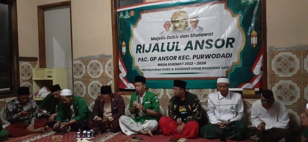 Purwodadi _ Bertempat di Mushola Nailun Najah Desa Gajahrejo Kecamatan Purwodadi, Pimpinan Anak Cabang Gerakan Pemuda Ansor Purwodadi menggelar Rutinan Majelis Dzikir dan sholawat Rijalul Ansor. Acara tersebut diikuti oleh 97 Anggota Ansor yang berasal dari seluruh Pimpinan Ranting se Kecamatan Purwodadi (4/6/2023). Kegiatan di mulai sejak pukul 19.00 hingga selesai dengan diawali pembacaan maulid dan amalan Aswaja Annahdliyyah yang lain.